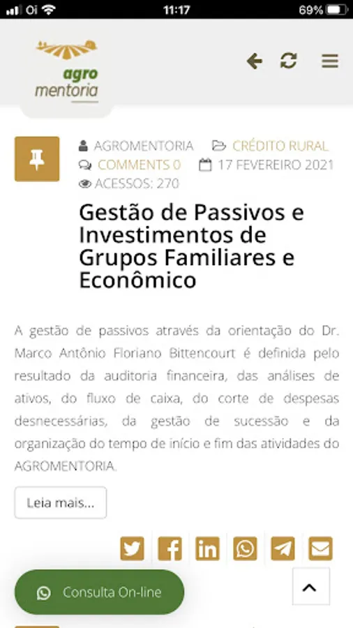 AGROMENTORIA aims to assist and advise rural producers and agribusiness companies in order to choose the best strategy for the acquisition of farms, sale of goods, investments, raising financial resources, management and settlement of credit liabilities under the mentorship of Dr. Marco Antônio Floriano Bittencourt. AGROMENTORIA believes that the retrograde concepts of fomenting legal disputes are methodologies that should be kept in the past by those who truly intend a new advantageous way of managing their businesses and overcoming their dilemmas. AGROMENTORIA consists of guidance by professionals interconnected online and managed by Dr. Marco, who compiles financial and market information, whenever necessary, enabling the client to decide on the best business strategy to be adopted, always with the objective of reducing cost and profit expansion. AGROMENTORIA assists in the acquisition of credit rights for rural properties, with a significant reduction in the market price, aiming at investment based on the financial system, tracing together with the client the path from acquisition to ownership of the “Farm”. With AGROMENOTORIA the customer does not need to travel, due to the aforementioned online service, and the possibility also of virtual meetings, making better use of their time in their own business, thus saving unnecessary expenses. AGROMENTORIA goes to the client, physically or virtually, is together, participates in business decisions, outlines strategies and provides the necessary information for the decisions that will determine the new directions of Family Groups, Economic and Agribusiness Companies.