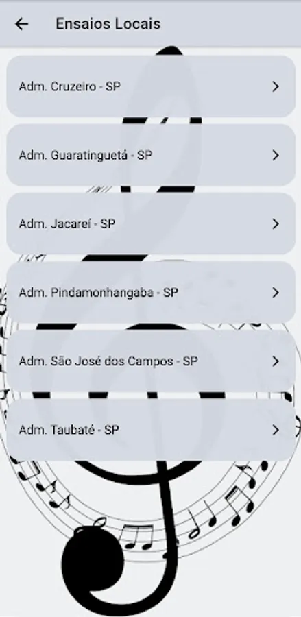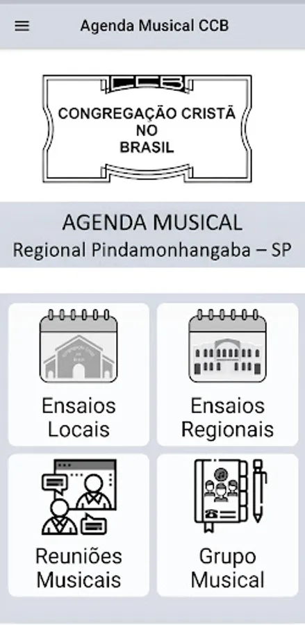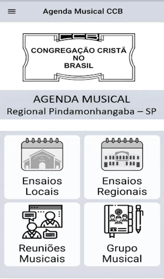 CCB Musical Agenda of local rehearsals, regional rehearsals and musical meetings of the Regional of Pindamonhangaba - SP, covering the administrations of the following cities: Cruzeiro, Guaratinguetá, Jacareí, Pindamonhangaba, São José dos Campos and Taubaté.