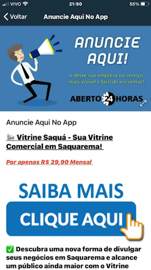 Business Opportunities: Whether you are a restaurant, store, hotel, beauty salon or service provider, Vitrine Saquá provides a virtual showcase to display your exclusive offers, special promotions and events. Take advantage of business opportunities and increase your sales.
