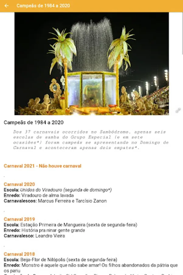 - remember the classifications of samba schools (with the respective plots and carnivals) from the first official parade, year after year, and in exclusive tabs by association;
