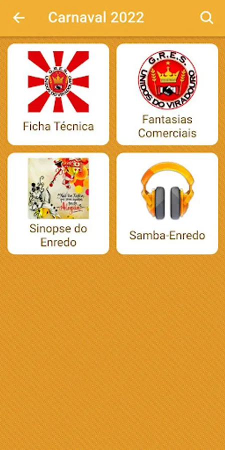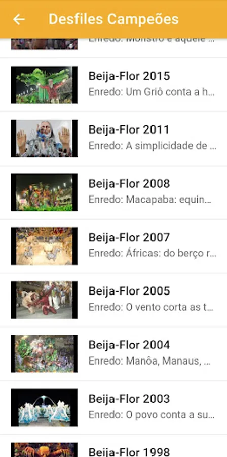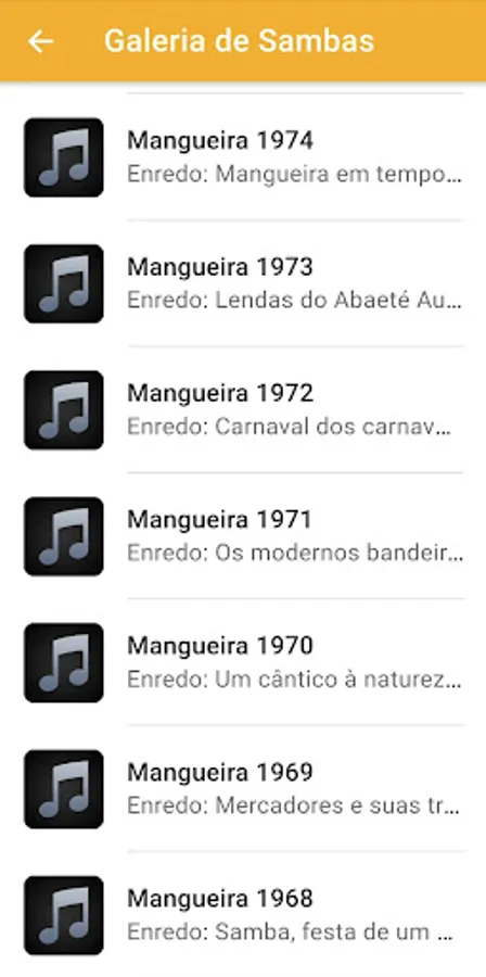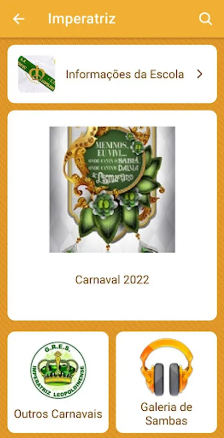 - listen to all the sambas-enredo, year after year, in an exclusive gallery for each samba school (still under construction: starting with Empress Leopoldinense and, soon, covering all schools in the Special Group);