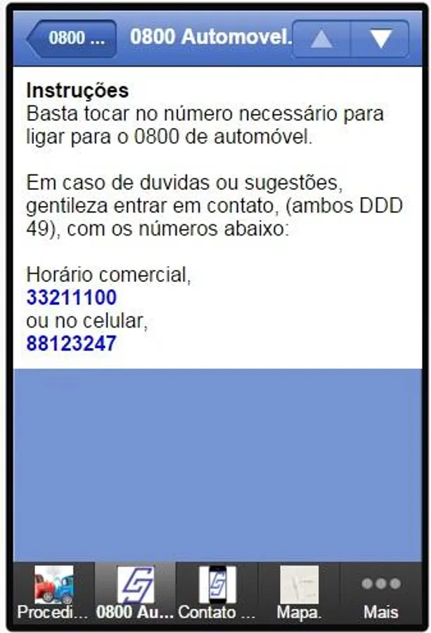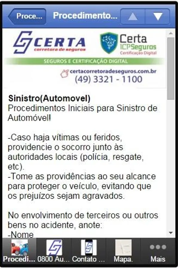 This app is in the 0800 contact for sinister of all stances that partners of CERTA also available contacts of the Public Emergency Services, e-mails brokerage, business contacts, our address, Facebook, and a little of our history , mission, vision and values.