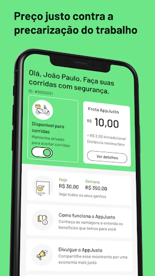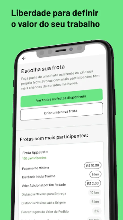 AppJusto is a platform that does not give space for precarious work, the value of the delivery is fully transferred to the delivery person (excluding financial fee). Here you not only define your schedules, but also the price to be charged for deliveries via fleets - more about them below! In the basic fleet of AppJusto, in runs of up to 5km the price is 10 reais, and after that 2 reais per km.