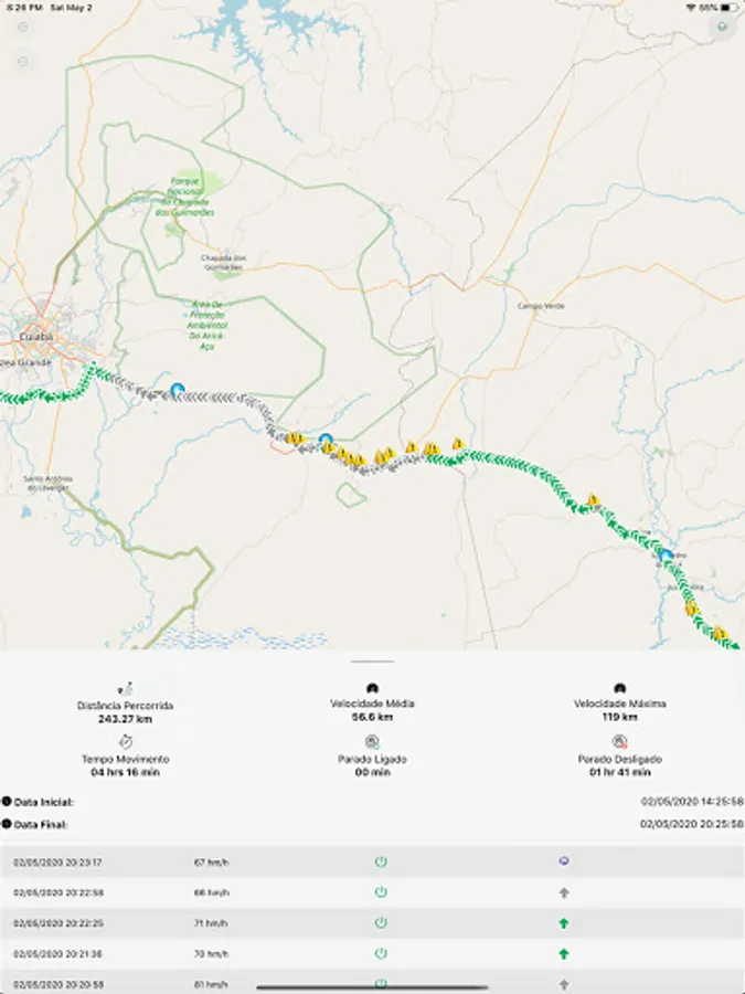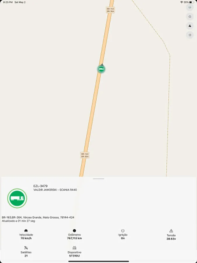 - Live map showing all of your trackable or individually, with custom icons identifying the status and direction of the trackable. Various information of the trackable in real time, such as: speed, battery voltage, quality of the GPRS signal, number of GPS satellites, odometer, hour meter, entry status, identified driver, among others.
