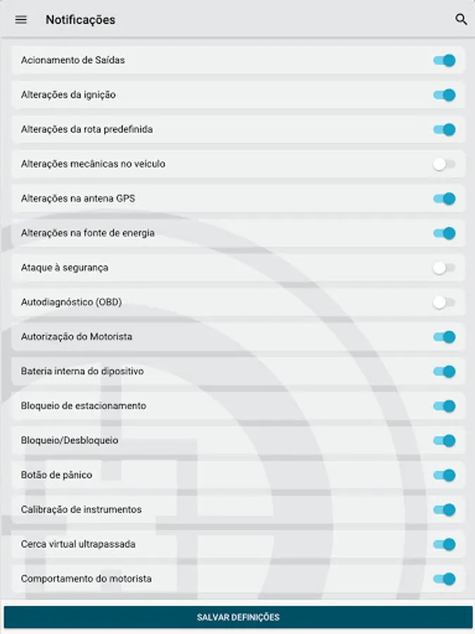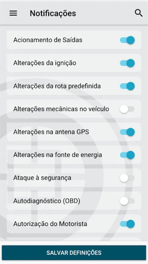 - Personalized push notifications, where the user himself chooses which types of alerts he wants to receive through push. There are 30 categories of alerts available to the user, among them: ignition change, violated speed limit, security attack, panic, among others.