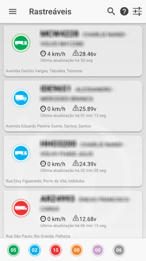 - Complete list of traceable in real time, with address of the location and speed. Totaled and separated by status, allowing to identify which ones are onLine, offLine, in movement or stopped, with ignition on or off.