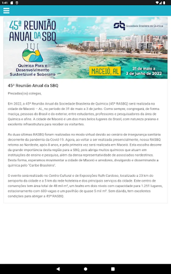 In 2022, the 45th Annual Meeting of the Brazilian Chemical Society (45th RASBQ) will be held in the city of Maceió - AL, from May 31 to June 3. As always, it will bring together, in a massive way, people from Brazil and abroad, including students, professors and researchers in the field of Chemistry and the like. The city of Maceió is one of the most beautiful places in Brazil, with beachy nature and excellent infrastructure to welcome visitors.