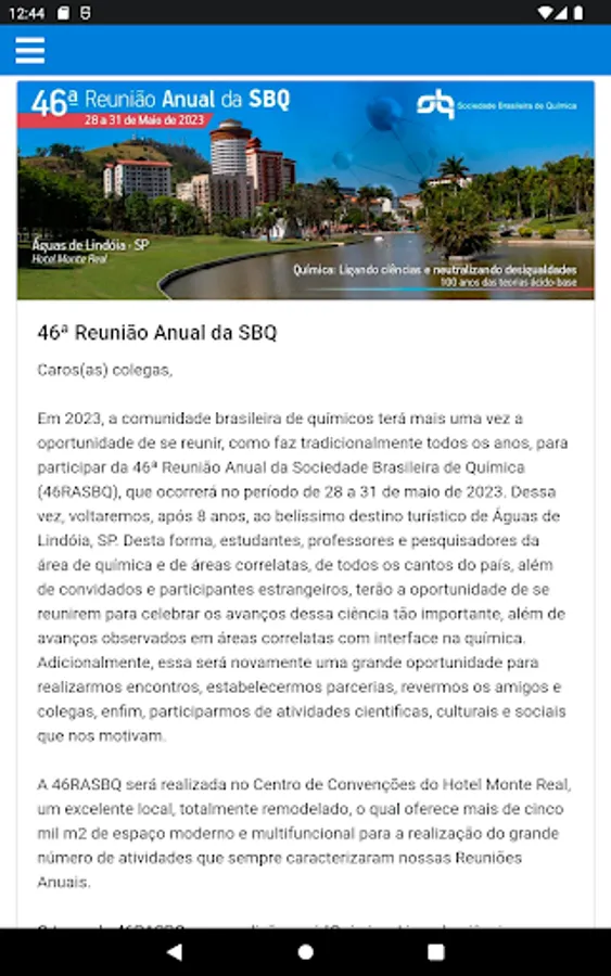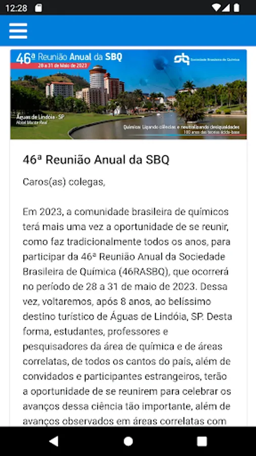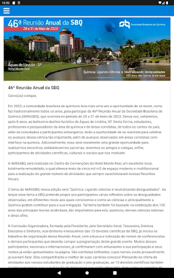 In 2023, the Brazilian community of chemists will once again have the opportunity to gather, as it traditionally does every year, to participate in the 46th Annual Meeting of the Brazilian Society of Chemistry (46RASBQ), which will take place from May 28 to 31 de 2023. This time, we will return, after 8 years, to the beautiful tourist destination of Águas de Lindóia, SP. In this way, students, professors and researchers in the area of chemistry and related areas, from all corners of the country, in addition to foreign guests and participants, will have the opportunity to get together to celebrate the advances of this very important science, in addition to the advances observed in correlated areas with an interface in chemistry. Additionally, this will again be a great opportunity for us to hold meetings, establish partnerships, see friends and colleagues, in short, participate in scientific, cultural and social activities that motivate us.