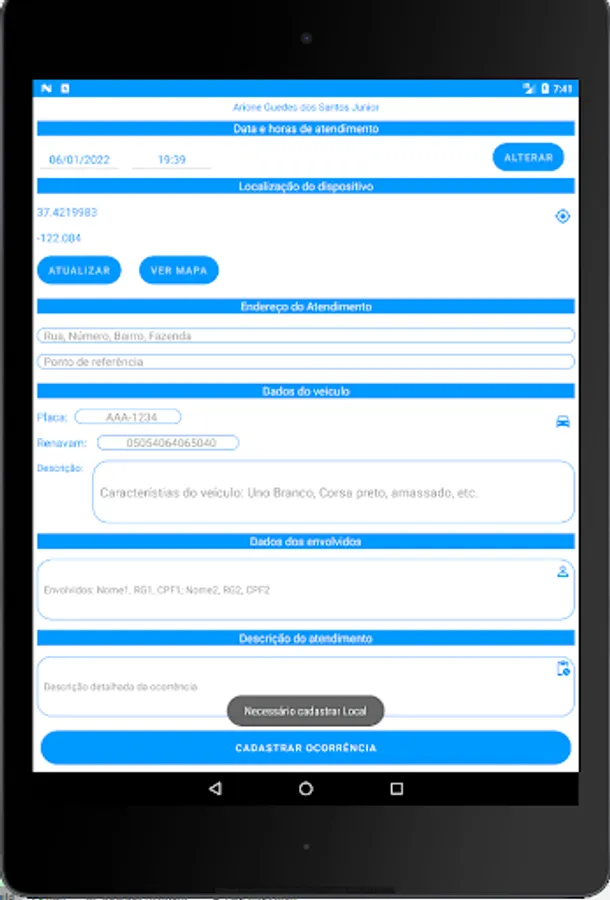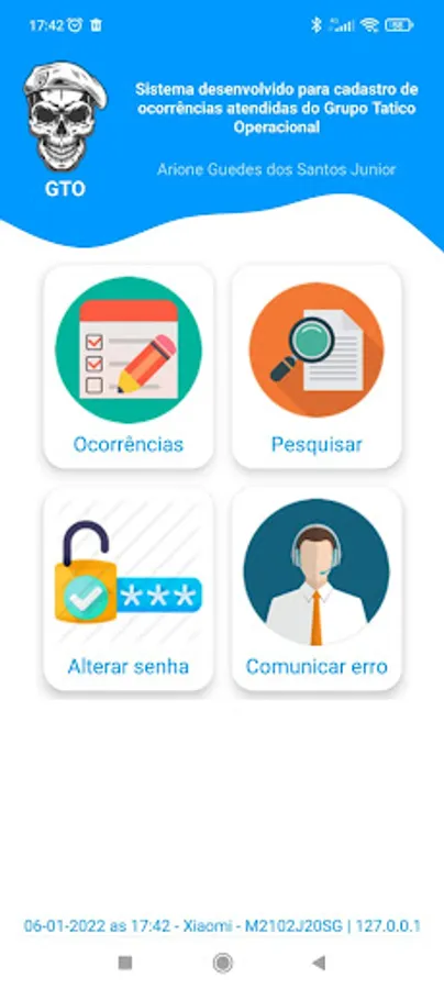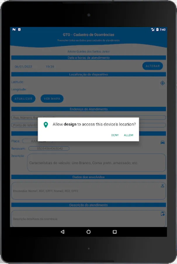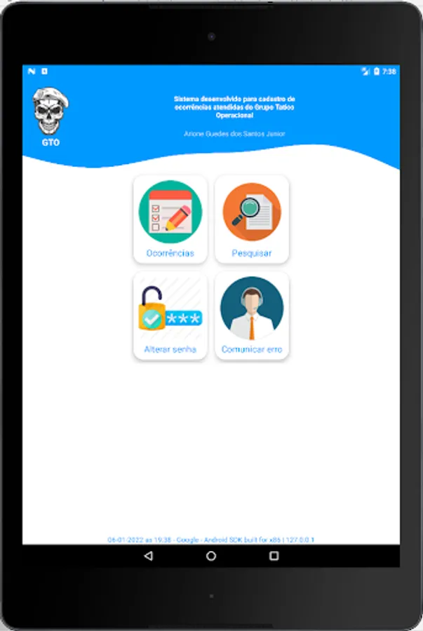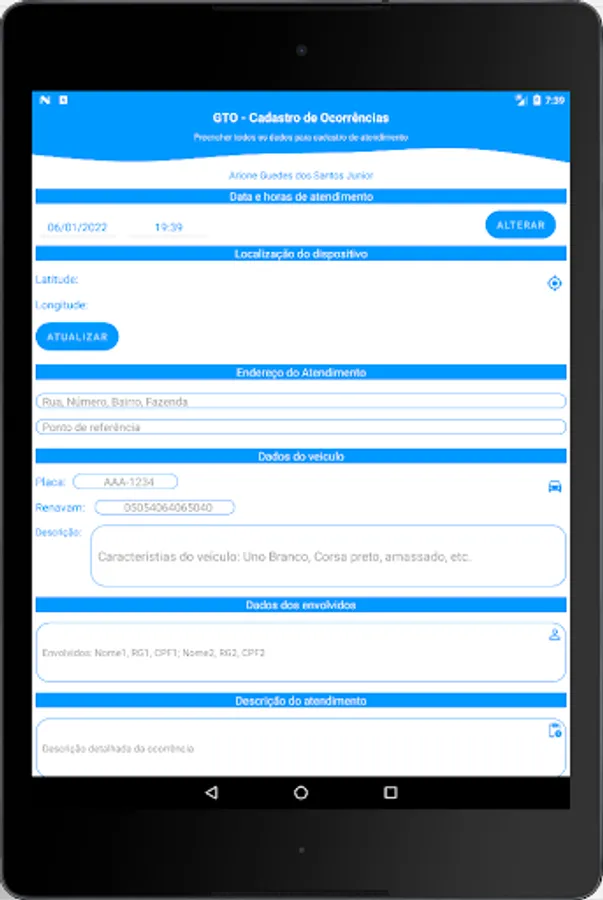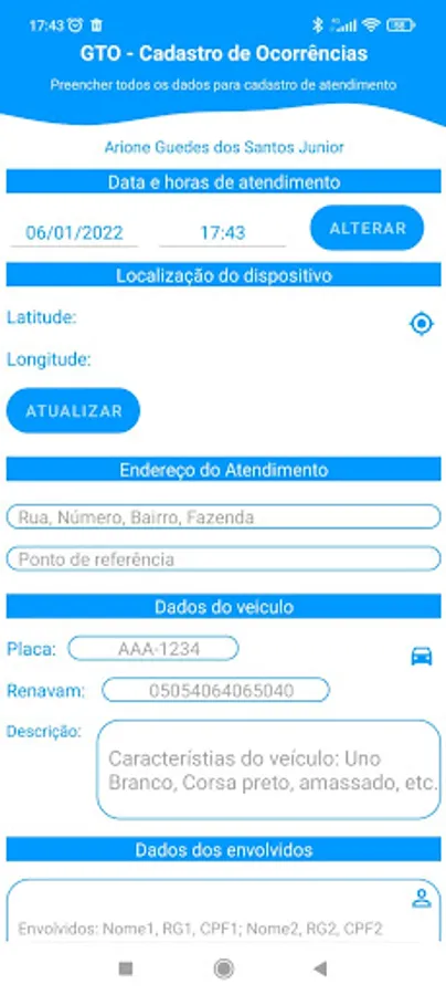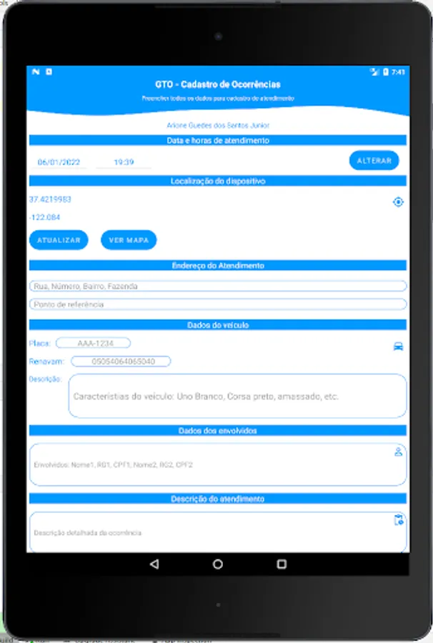 The application is being developed so that it will save data on occurrences attended by the GTO in Costa Rica - MS, so that it has saved information that enables the creation of attendance reports and occurrence statistics.