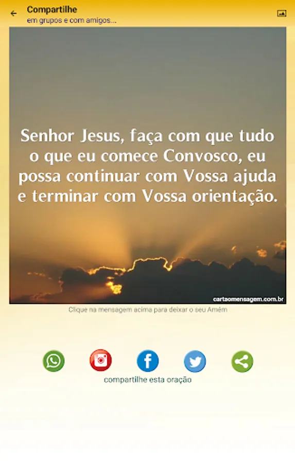 Choose from dozens of beautiful background images and share the prayer card via Facebook, Whatsapp, Instagram, Google+, Twitter, SMS, email or many other available options.