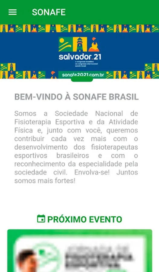 Institutional application of the National Society of Sports Physiotherapy and Physical Activity - SONAFE BRASIL. News, announcements, events, restricted access for members and more.