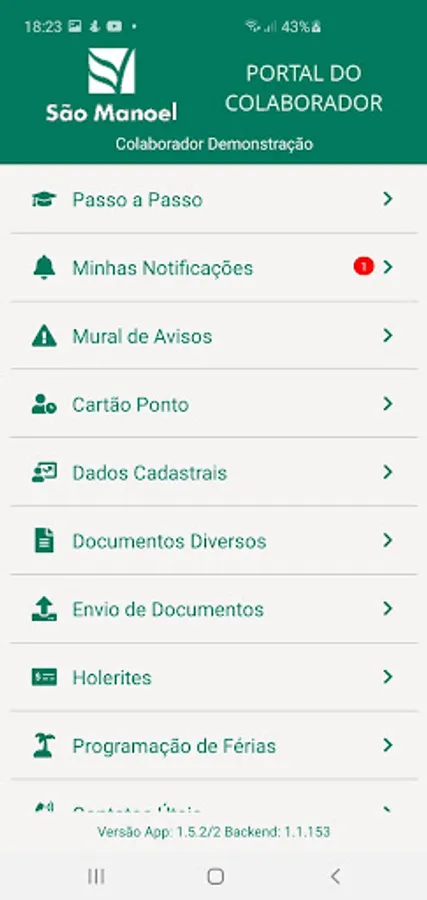 Usina São Manoel's Collaborator Portal application allows its collaborators to consult payslips, time and attendance mirrors, communications (notice board), perennial documents, useful contacts, sending documents.