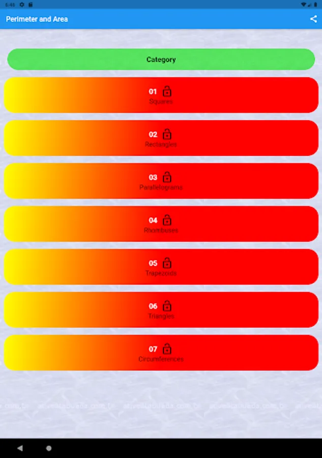 Flat figures: squares, rectangles, parallelograms, rhombuses, trapezoids, triangles and circles.