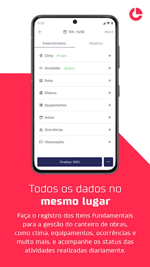 With features such as recording activities, photos, personnel and others, you can follow the progress of your work and ensure that everything is properly documented for future references. In addition, our system allows you to easily access information with your team and other stakeholders, ensuring that everyone is up to date on the status of the work.