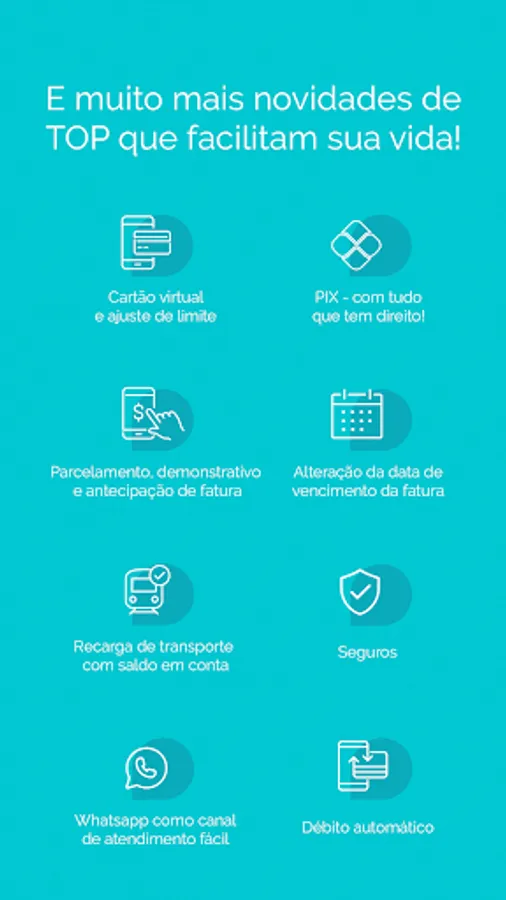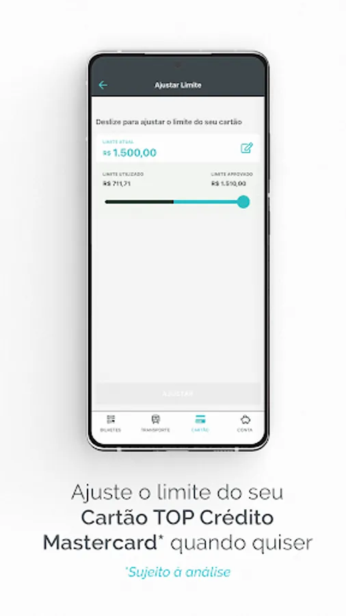 From transport to credit card, with the TOP app you can load and buy transport tickets, manage your digital account, check whenever you want and adjust the limit of your TOP Mastercard* credit card, in addition to being able to pay and pay your bills in installments with just a few clicks. And of course, many other TOP features for you to make the most of your day.