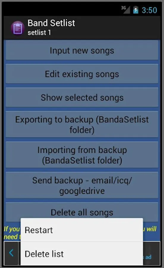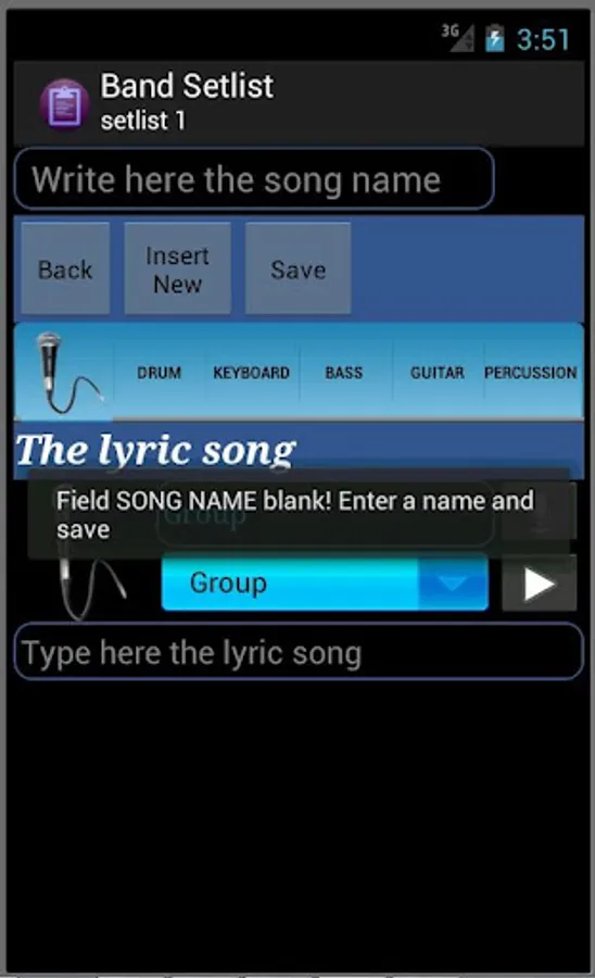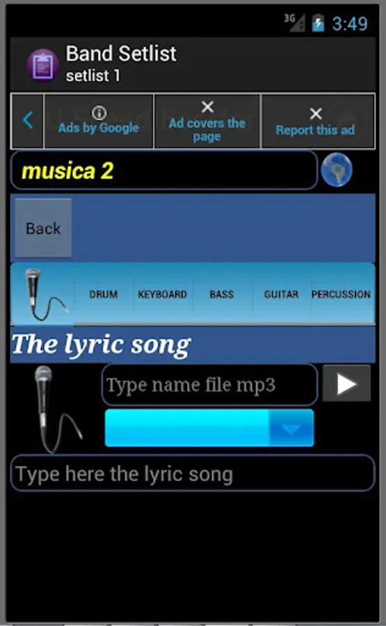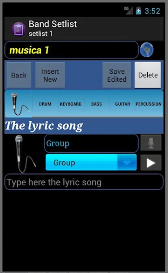 With Band Setlist you can assemble a complete list of songs with lyrics and chords for keyboard, drums, guitar, bass and percussion. For drums and percussion grooves just write the sequence for each set. For convenience, so writing the song name and save, just click on the globe that redirect to google page in search of the entered name, and then just copy the site chosen the lyric and chords.