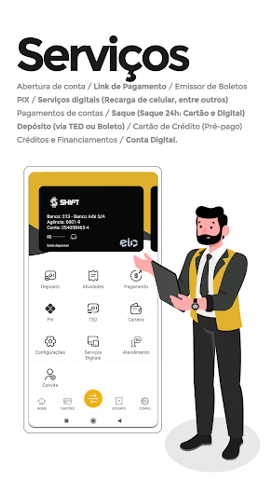 Use our APP to receive and charge friends, service providers or commercial establishments, Transfer and Receive PIX, Ted, Recharge Services, among others.