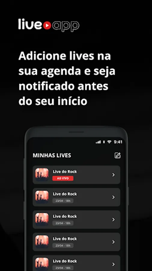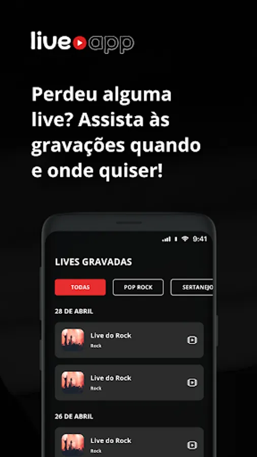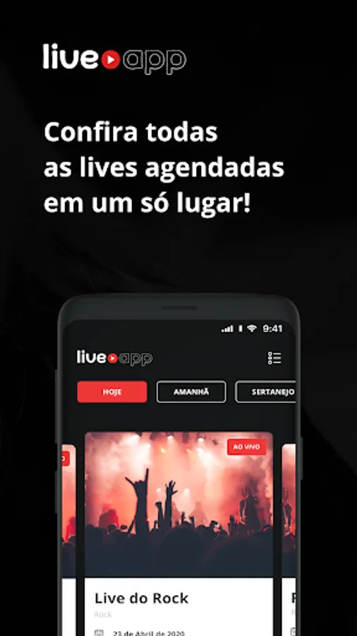 The LiveApp is a free and modern schedule of lives, where you stay on top of the shows of artists that are happening on the internet. With it you know which artist will perform, the date, the time and the online platform where the show will take place. Do not miss any live and follow your favorite artists from home! With the LiveApp you can access all the content through filters and choose which shows you want to watch.