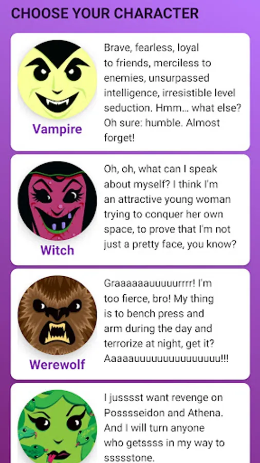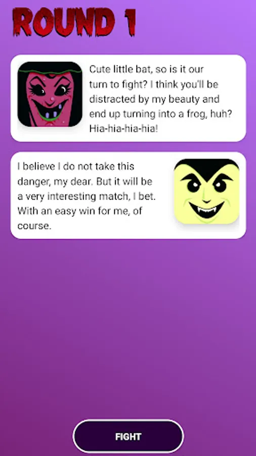 Casual game based on Jokenpo (Rock, Paper and Scissors) battles, using as characters cartoon versions of some of the most famous monsters in cinema and literature (Vampire, Witch, Medusa, Werewolf, Mummy and Frankenstein).
