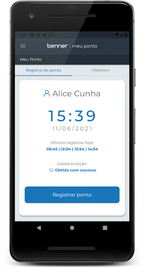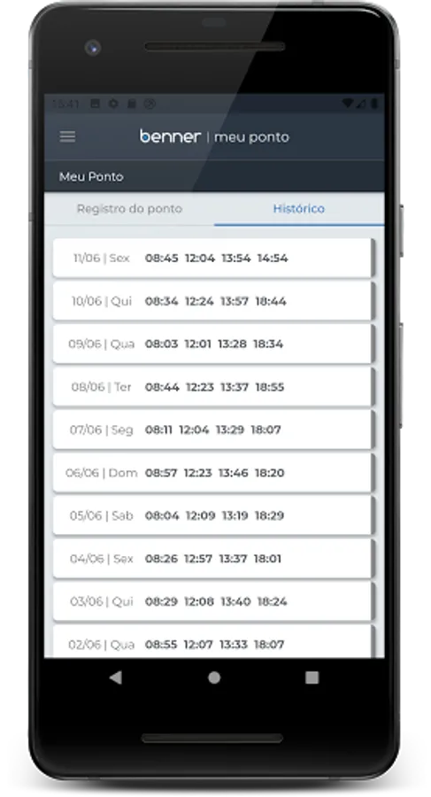 In line with the standards defined in MTE Ordinance 373/2011, the Benner Meu Ponto application can replace the traditional collector. In addition, it allows you to consult the bookmarks already made in a simple way, just by accessing the History tab.