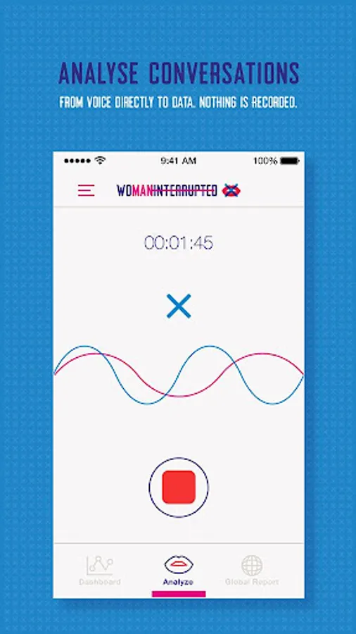 Using the microphone on your device, the app detects whenever a male voice interrupts you (for female users) and whenever you interrupt a female voice (male users). Don’t worry. No audio is recorded: everything goes directly from sound to data.
