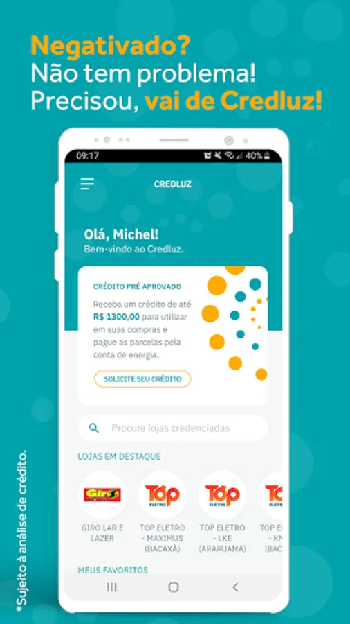 Credluz is a credit solution to buy in a practical way and without bureaucracy, even for those who are negative *. You access the application, make your registration and being approved has your limit released to use, paying the installments in your energy bill, in up to 24x, to make your life even easier!
