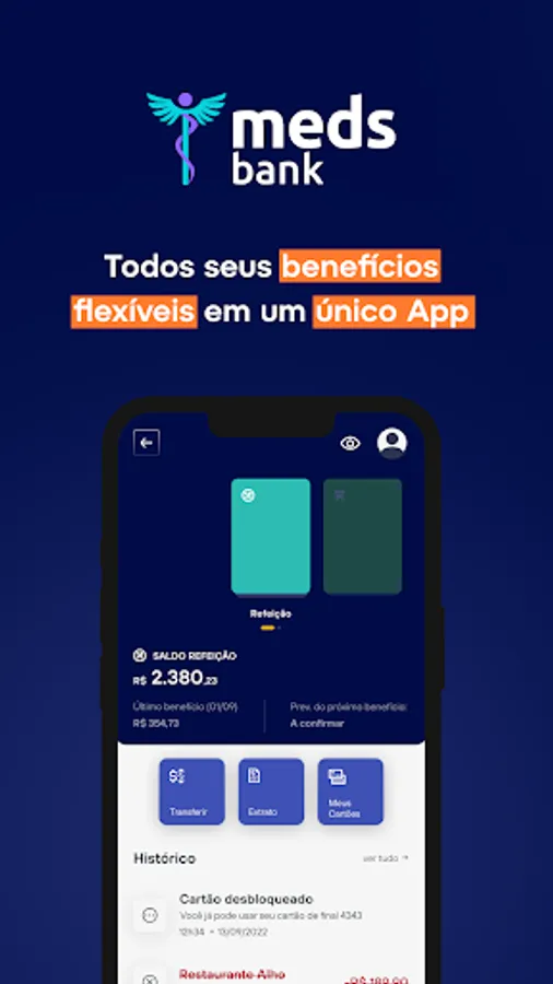 Meds Bank Multibenefits is a Biz Tecnologia payment method application that offers a complete experience of flexible benefits in one place. With features that facilitate access and control of your benefits, such as: