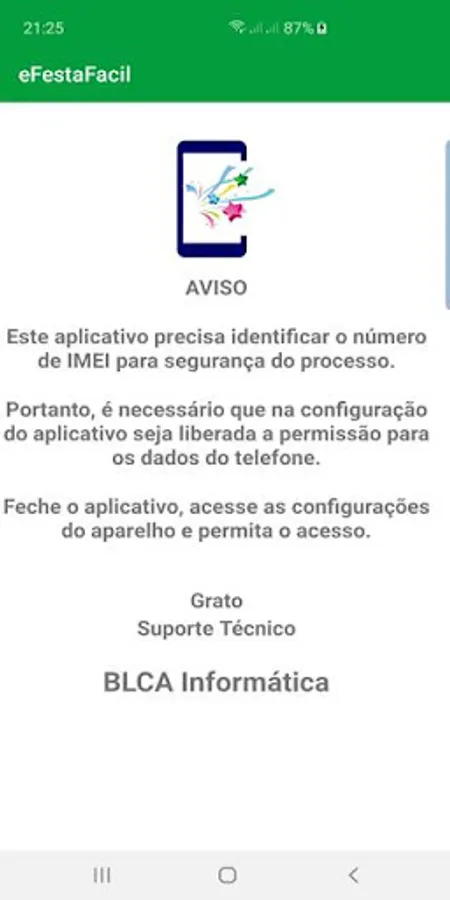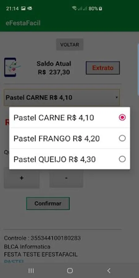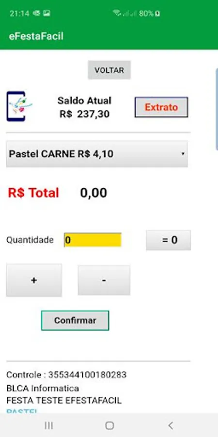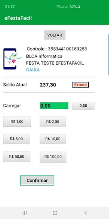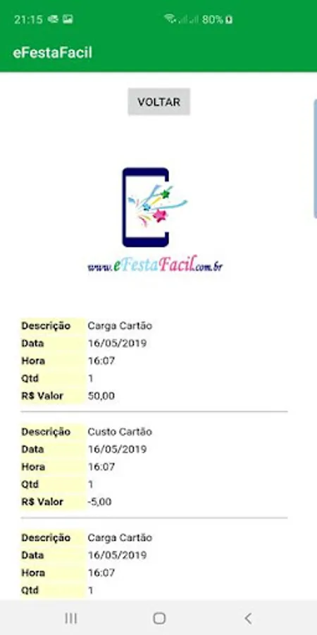 This application does the financial management of parties through special commands with QRCODE coding. The financial figures are loaded on the card and used in the tents or point of sale, all through the cell phone, without the need of installing any network or cable.