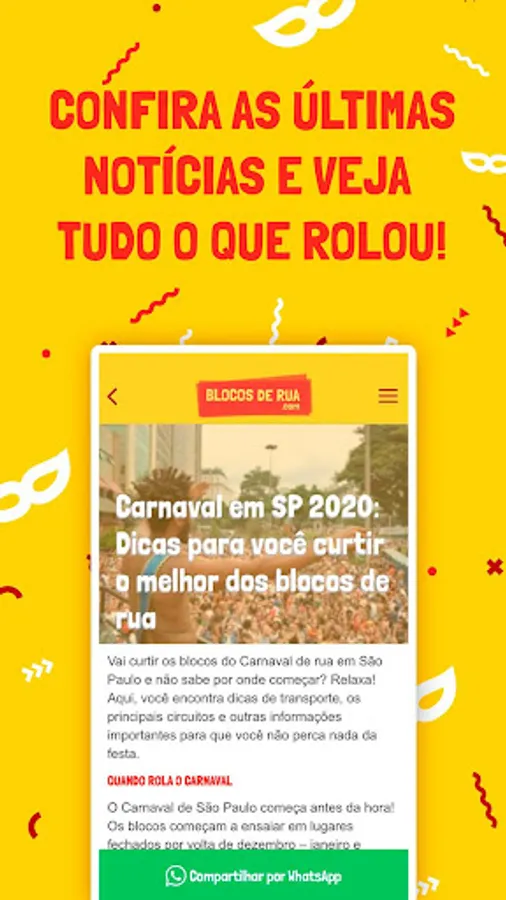 Do like more than 4 million people and use Street Blocks, the featured app from Google Play in 2017, 2018, 2019 and 2020 helps you organize your carnival! Check the schedule and agenda of the Carnival Blocks of São Paulo, Rio de Janeiro, Belo Horizonte (BH), Salvador, Florianópolis, Recife, Olinda, Brasilia, Porto Alegre and Fortaleza 2020, in addition to the parties, rehearsals, and the best of pre and post Carnival updated daily.