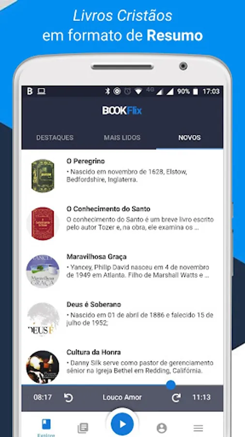 O BookFlix extrai a ideia dos melhores livros cristãos e compacta em um resumo de até 15 minutos pra você poder ler ou escutar onde estiver da forma mais prática possível!