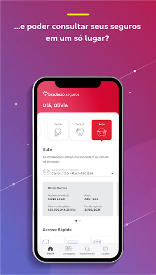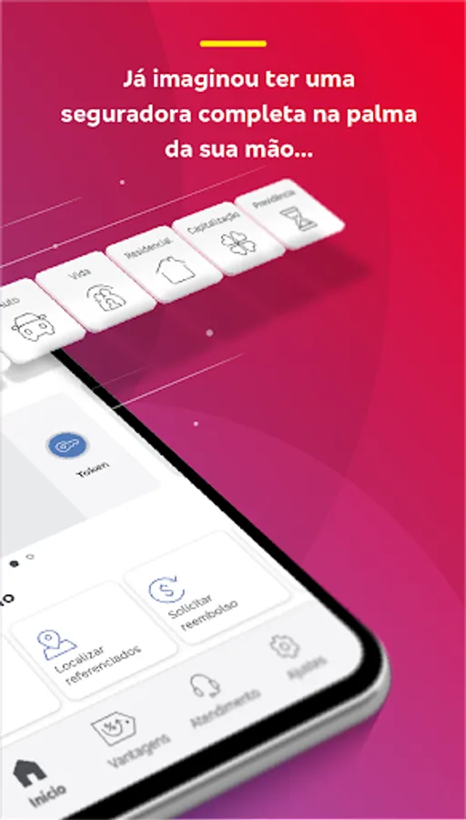 • Auto: your vehicle protected 24 hours a day. Consult your policy and payments or request assistance in case of a flat tire, need for a keychain, lack of fuel and breakdown or collision, directly through the app!