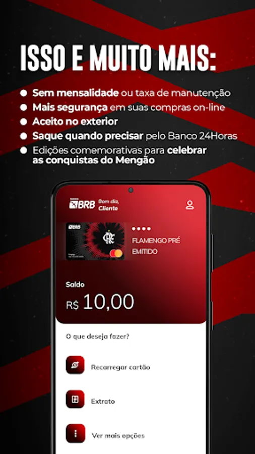 Red-Black Greetings. With Flamengo's prepaid card, you have much more ease in your day-to-day life, in addition to being part of the Nação Rubro-Negra bank. Best of all: no maintenance fee and a minimum charge of just R $ 10. Enjoy the benefits of the card to manage your expenses and make purchases.
