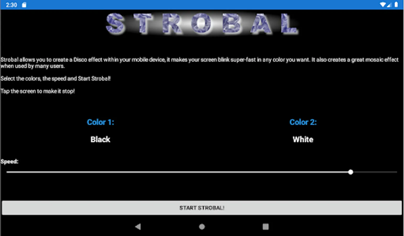 Choose between over 20 colors and speed options to customize your Strobal app.