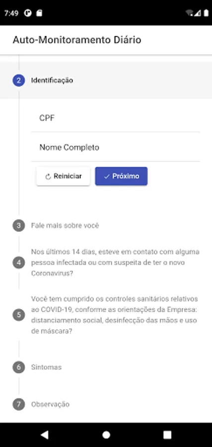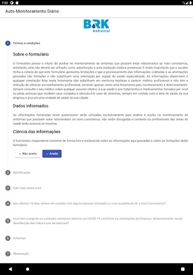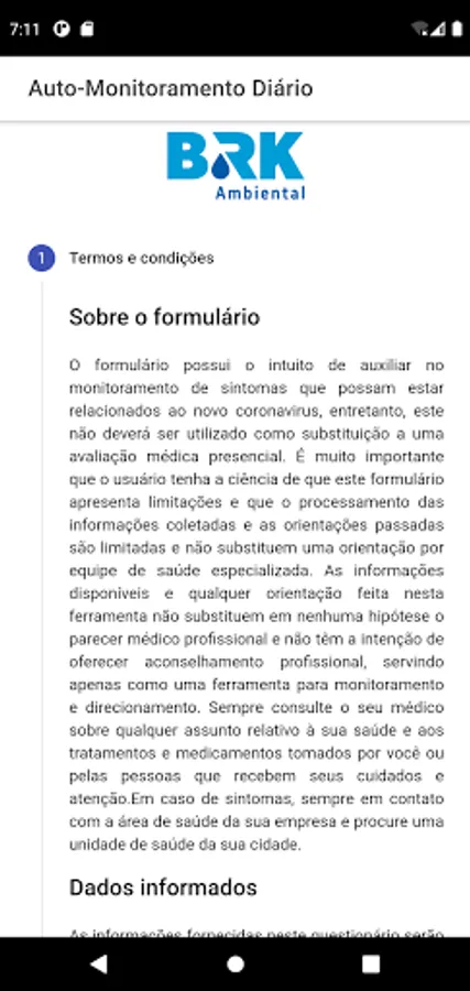 Daily monitoring application for the BRK Ambiental team. With the Self-Monitoring application, our employees can register their Covid-19 health indicators and preventive measures on a daily basis so that the medical team can provide the appropriate care and monitoring.