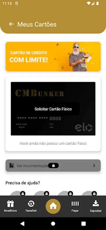 No fine print and no asterisks. CMBUNKER is much more than a bank! With the digital account, you have several credit options, in addition to a debit card with no annual fee, free TEDs via Pix and with scheduling option, cashback purchases at Mkt Place, payment with barcode reader, withdrawals on Banco24Horas Networks, in addition to of deposit by auto slip or identified slip!