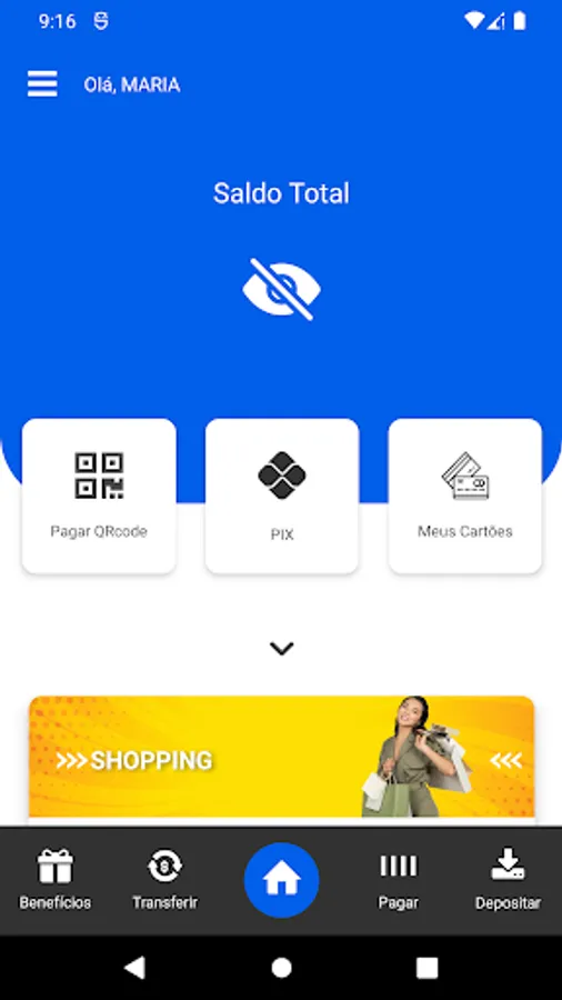 Complete digital bank: digital account, investments, shopping, credit card, debit card, virtual card, QR