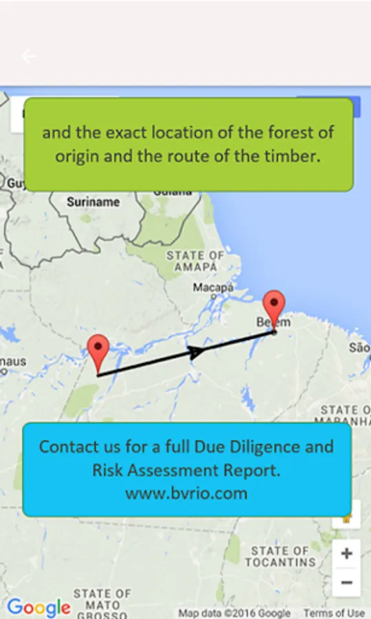 The app is part of BVRio's Timber Products Legality Verification System, a component of BVRio's Responsible Timber Exchange, a trading platform for legal and/or certified timber products of legal origin. It is part of a due diligence system that consists of a framework of procedures and measures designed to assess the compliance with the applicable legislation, to facilitate the traceability of the chain of custody and to identify evidences of possible fraud and illegality.