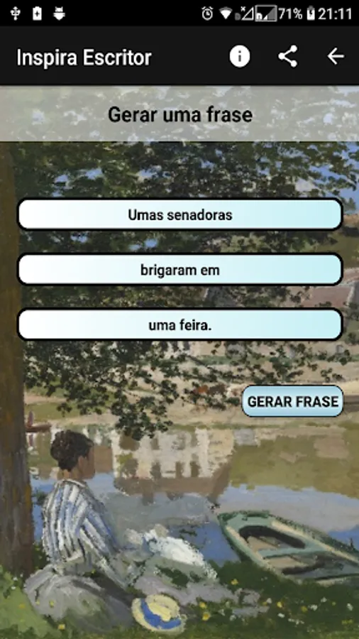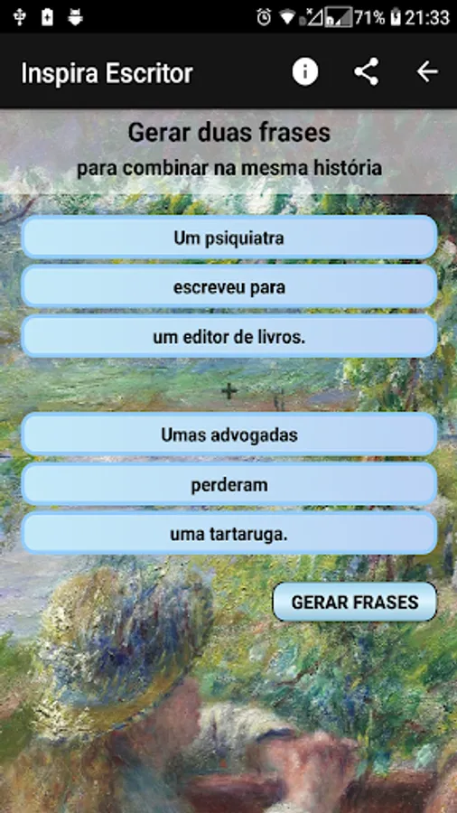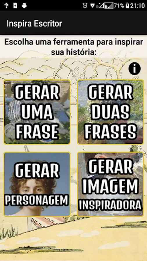 When a writer has a block to write, he can seek inspiration in this application and create his own stories, as phrases or images can be used both to inspire a beginning of history and to unlock a lack of ideas already in the middle of writing.