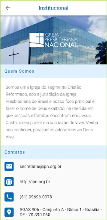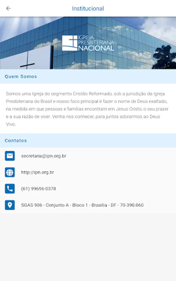 The Church National Presbyterian, based in Brasilia since the founding of the Federal Capital in 1960, is committed to the Bible as the rule of faith and practice, adopting the Westminster Standards (Confession, Shorter Catechism and Large Catechism) as fair review of the issues addressed in Scripture. The IPN is jurisdiction over the Presbyterian Church of Brazil.