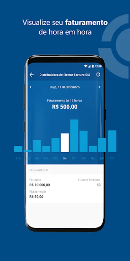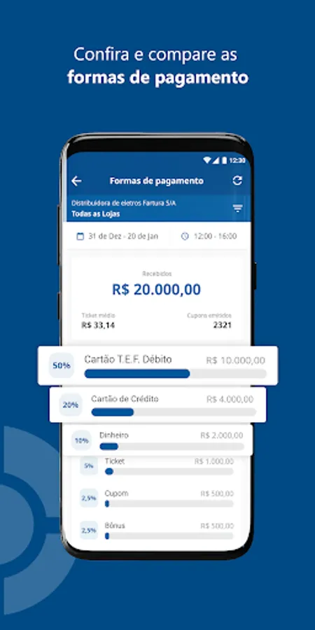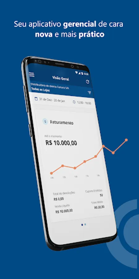 - Billing overview with information on value sold, returns, average ticket and quantity of coupons issued.