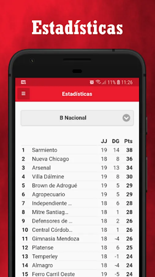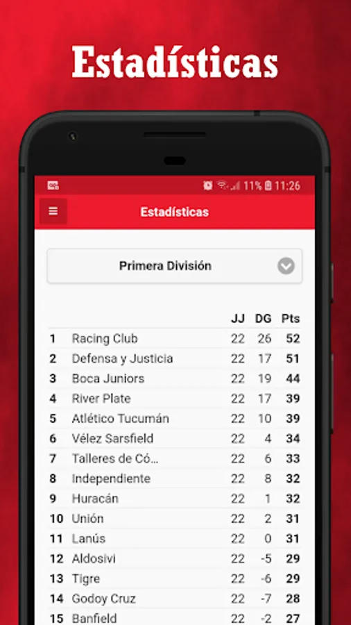 - Statistics: follow the classification of the first division (Superliga), second division (B Nacional) and Libertadores
