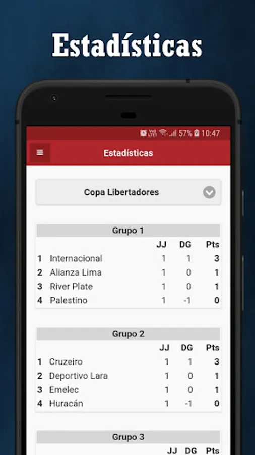 - Statistics: follow the classification of the first division (Superliga), second division (B Nacional) and Libertadores