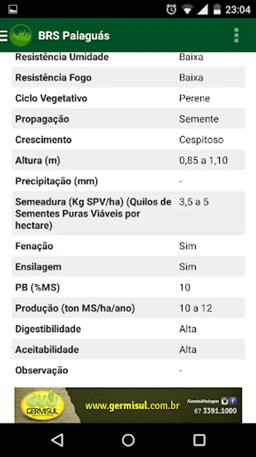 - Technical Information: Each Pasture displays various information about Origin, Drought Resistance, Vegetative Cycle, digestibility, among other