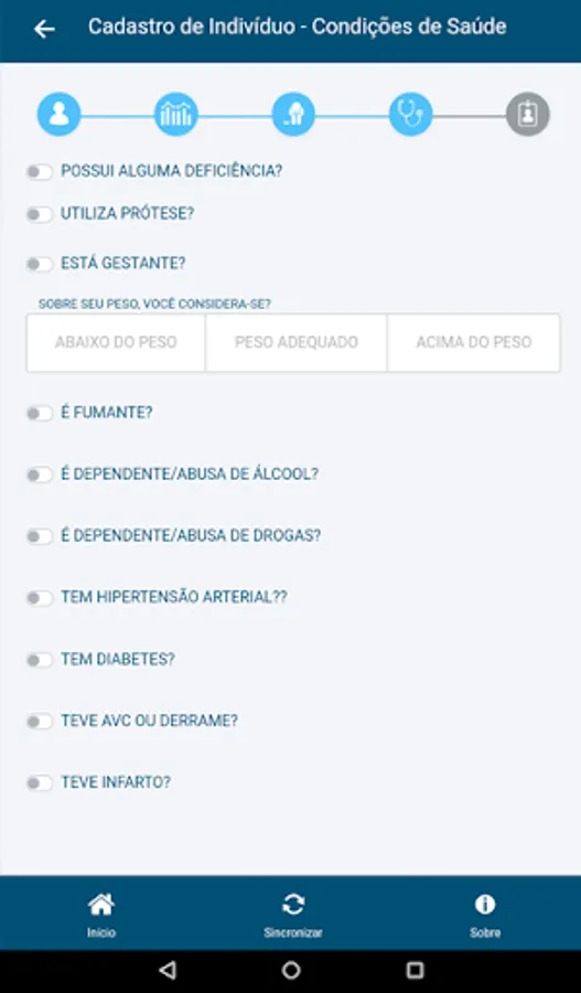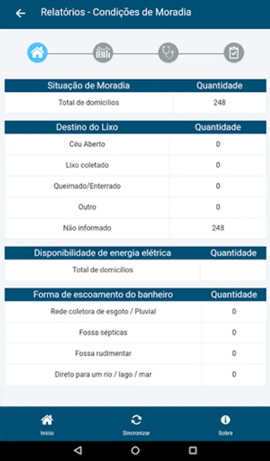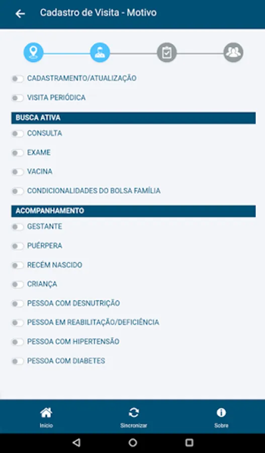 Through it, the health agent will be able to register the households in his area of activity, the people he serves, home visits, group activities and the eating habits of the families. In addition to having several reports such as: housing conditions, socio-demographic situation, health situation and summary of your productivity.