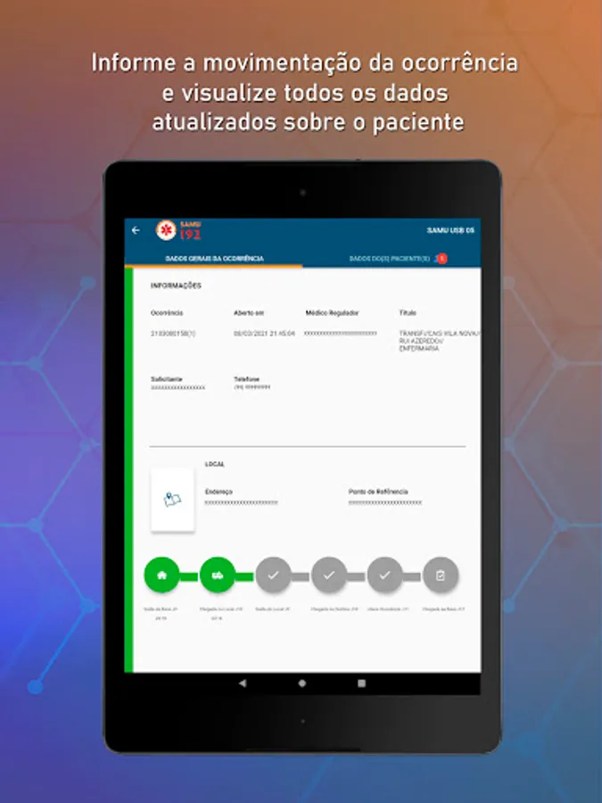 The App receives the occurrences sent by the SAMU Emergency Regulation Centers in Brazil, allowing professionals to have real-time information about the occurrence. The Mobile Urgency app, assists in the attendance with the visualization of the patient's health data, with the registration of the movement of the vehicle and with the location of the occurrence on the map.