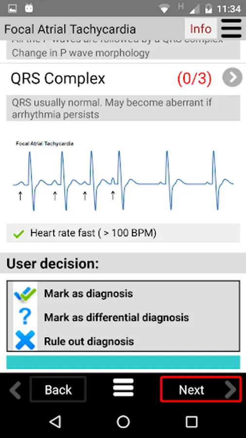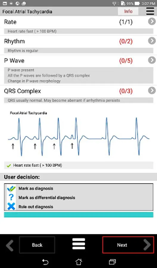 The user answer a series of simple questions based on the presence, absence, or measurement of various characteristics on a patient’s ECG rhythm.