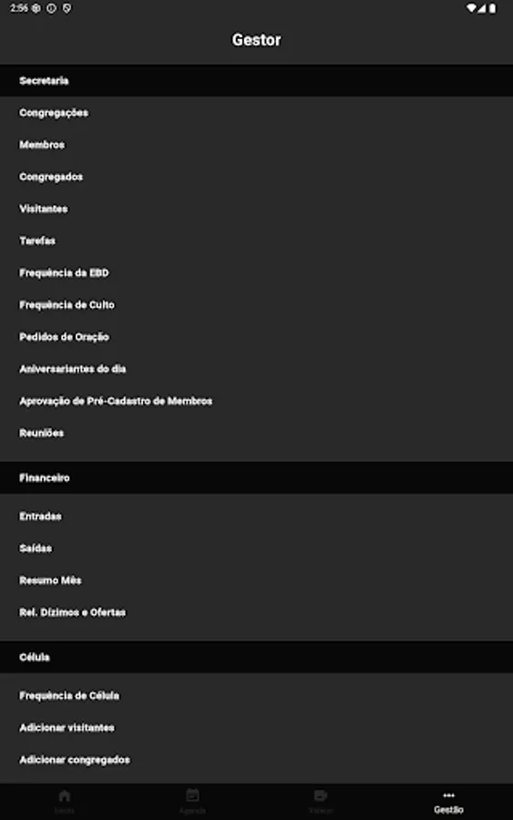 Managing your church will be much easier with this app integrated with the CHURCH system, with the possibility of financial reports, checking entries, exits, member control, congregation consultation, responses to prayer requests, access to birthdays, among many other functions.