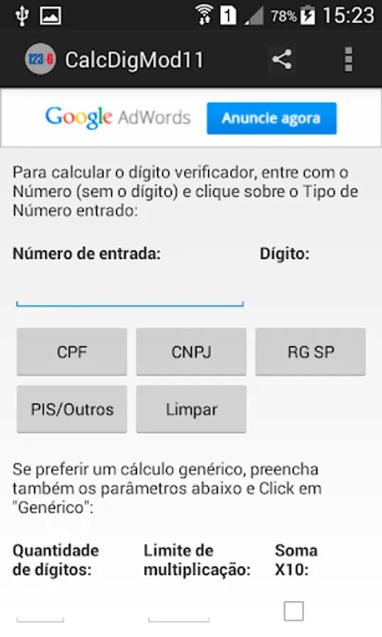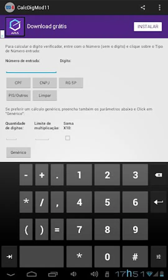 This application allows you to calculate the check digit numbers through the module method 11. Digits checkers CPF, CNPJ, RG SP, PIS and others, such as some bank accounts are calculated by this method.