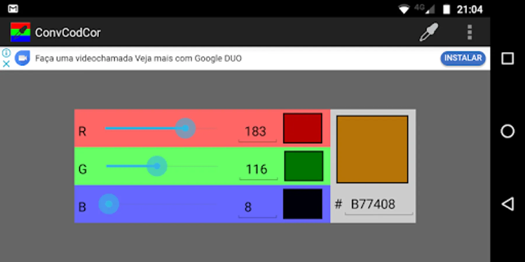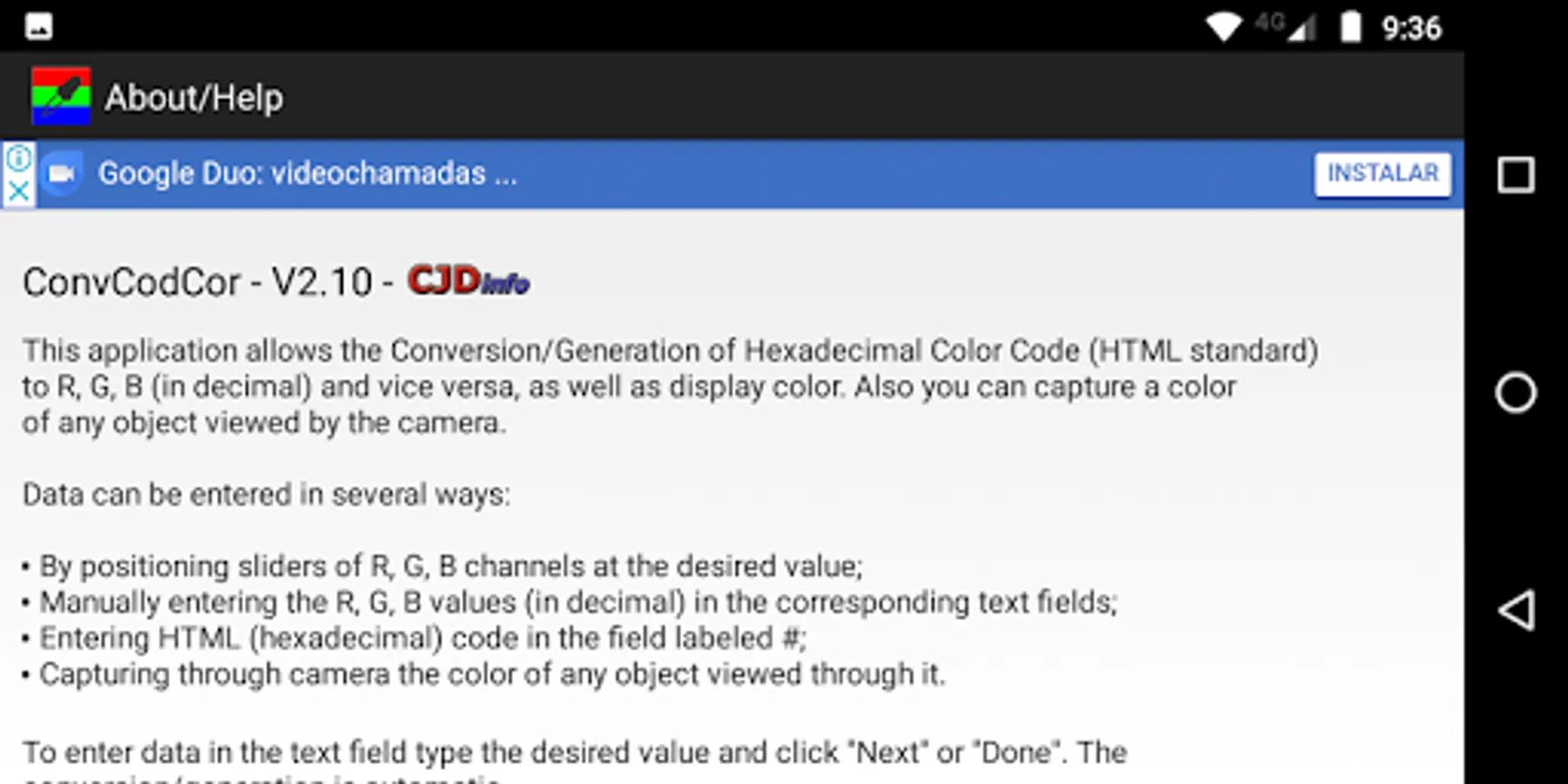 This application allows the Conversion/Generation of Hexadecimal Color Code (HTML standard) to R, G, B (in decimal) and vice versa, as well as display color.