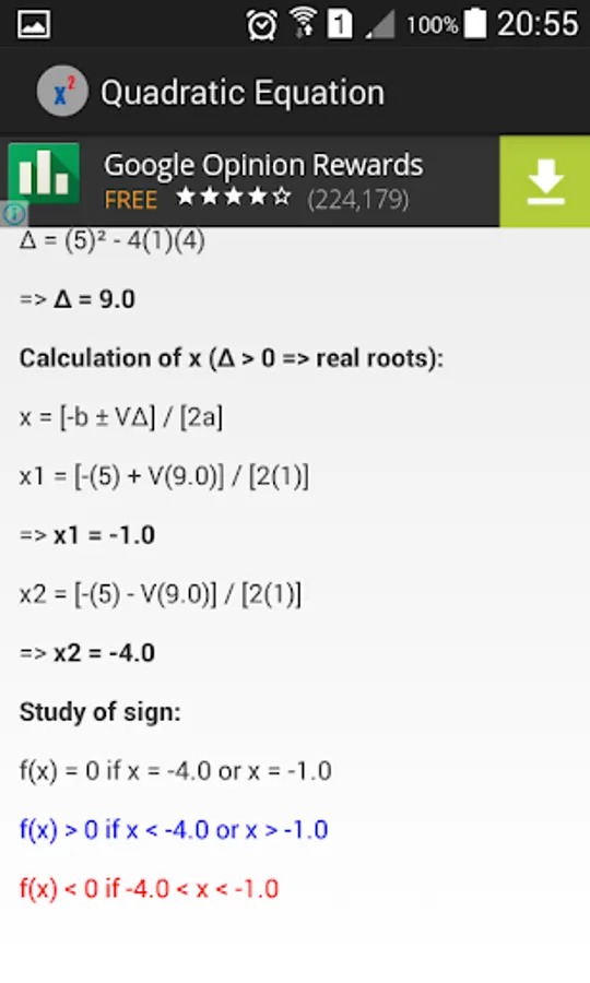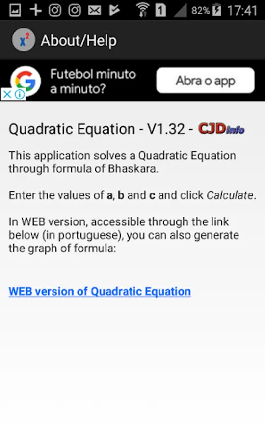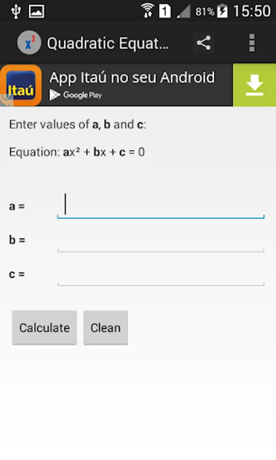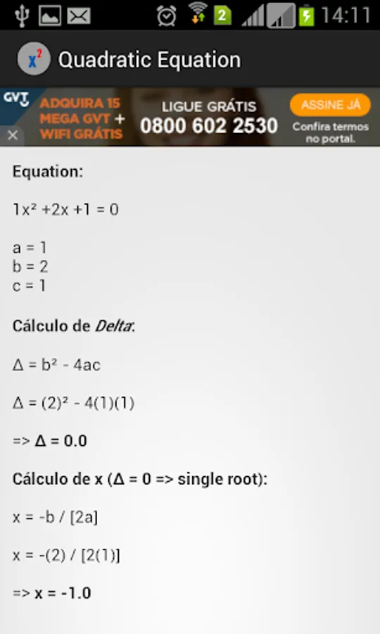 This application solves a Quadratic Equation (ax² + bx + c) using the formula of Bhaskara. Just enter the values of a, b and c. Shows the evolution of the calculation.